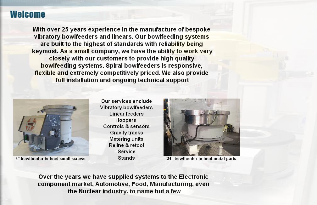 With over 25 years experience in the manufacture of bespoke vibratory bowlfeeders and linears. Our bowlfeeding systems are built to the highest of standards with reliability being keymost. As a small company, we have the ability to work very closely with our customers to provide high quality bowlfeeding systems to suit your part feeding needs. Spiral bowlfeeders is responsive, flexible and extremely competitively priced. We also provide full installation and ongoing technical support